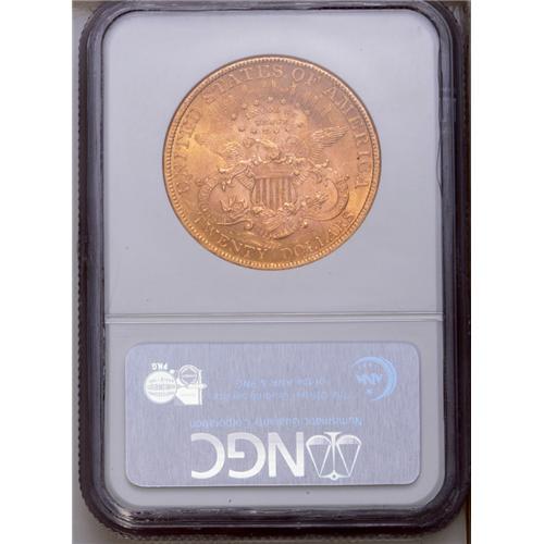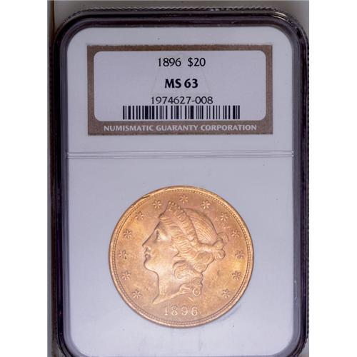 <B>1896<$20> MS63 NGC.</B></I> Richly colored, green-gold surfaces are well frosted for the grade. A sharp looking example with a typical abrasion count for the MS63 grade level.