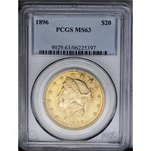 <B>1896<$20> MS63 PCGS.</B></I> Breen-7322. The date is nicely repunched, visible on all four digits. A lustrous and crisply struck example with attractive surfaces despite a few moderate marks on the left obverse.