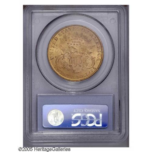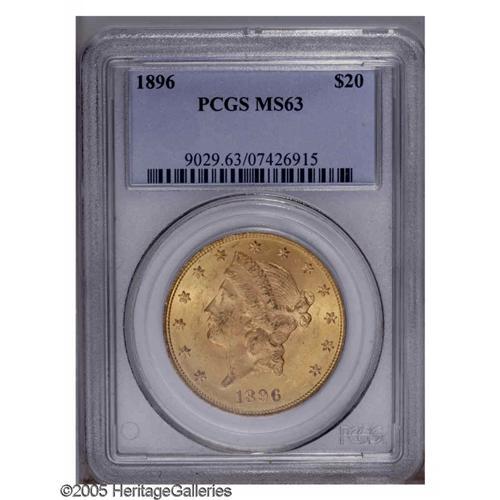 <B>1896<$20> MS63 PCGS.</B></I> This original greenish-gold Twenty Dollar gold piece exhibits sweeping cartwheel luster and has clean fields for the designated grade. Small marks on the cheek and chin preclude a higher classification.
