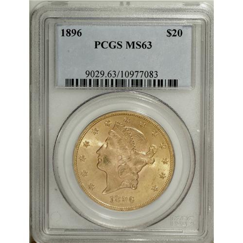 <B>1896 $20 MS63 PCGS.</B></I> Yellow-orange with a small red copper spot to the left of the shield, just below the wing. The luster is attractive, and the strike is attentive.<BR><BR><b>Shipping:</b> Coin/Currency (<a target="_blank" href="http://www.heritageauctions.com/common/shipping.php">view shipping information</a>)