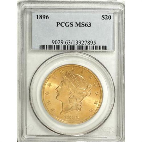 <B>1896 $20 MS63 PCGS.</B></I> Decisively struck with strongly lustrous yellow-orange surfaces, surprisingly appealing for the Select grade designation. A hint of haze has settled over the faintly abraded fields of this P-mint piece.<BR><BR><B>Coin Engraver:</B> James B. Longacre<BR><BR><b>Shipping:</b> Coins & Currency (<a target="_blank" href="http://www.heritageauctions.com/common/shipping.php">view shipping information</a>)
