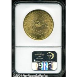 <table><tr><td><table><tr><td>1896 $20 MS64 NGC. The 1896 is considered a much scarcer date than the 1895 or 1897. It is most often seen in MS60-63 grades. Properly graded MS64s, such as this piece, are scarce and Gems are very rare. Sharply defined, the surfaces are satiny and show subtle rose and orange-gold coloration. Several tiny field marks are noted, but these do not detract from this coin's near-Gem appearance. Population: 128 in 64, 8 finer (4/04). <BR><BR><B>Important notice:</B> Heritage usually auctions material at the rate of 200-250 lots per hour. On some occasions eBay Live bid software or the Internet may not be able to keep up with the pace of the auction. We recommend placing a realistic absentee bid now as insurance to avoid disappointment. Occasionally the auctioneer may eliminate or reject an eBay Live bid, and the auctioneer may also reopen a lot after the close of the eBay live bidding (usually because we missed an audience bid), and may reject your bid even if it shows you as the winning bidder. By bidding via eBay Live, you agree that Heritage may award the lot to another bidder at its sole discretion under the circumstances described above or any other reasonable circumstances. Since eBay bids are not shown to us until we open the lot on the floor, we treat those bids just like floor bids. In most cases the floor responds before the eBay bid is presented to us, due to Internet lag time, so for consistency we have made it a policy that floor bids are always considered first over tie eBay live bids. Also please note that all Heritage lots purchased through eBay Live carry a 20% Buyer's Premium. Please make sure you read the Terms and Conditions before you bid. <BR><BR><B>IMPORTANT ANNOUNCEMENT ABOUT RESERVES:</B> Heritage now divulges all reserves on its web site 7 days before every auction. If you want to know whether the reserve on this lot has been met, and if not, what the reserve amount is, please visit this lot page on the HeritageCoin.com web site, or email: bid@HeritageGalleries.com </span></font></td></tr></table></td></tr></table>