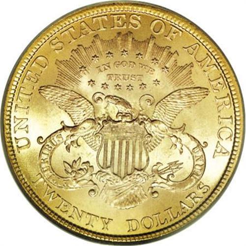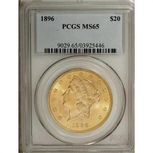 <B>1896 $20 MS65 PCGS.</B></I> Though the 1896 is considered one of the more available Type Three Liberty double eagle issues, it trades at a significant premium above type in Select and better grades. It was heavily repatriated in the 1960s and 1970s, but the vast majority of the Mint State survivors from those sources show heavy and distracting abrasions.<BR> By contrast, this sharply struck and shining Gem is a visual delight. The yellow-gold surface show subtle canary-yellow accents at the margins and just a touch of alloy near the truncation of the bust. The overall level of preservation is excellent, and the portrait is particularly clean. Tied for the finest certified by either NGC or PCGS, with just two such pieces graded by the latter firm (12/07).<BR><BR><B>Coin Engraver:</B> James B. Longacre<BR><BR><b>Shipping:</b> Coins & Currency (<a target="_blank" href="http://www.heritageauctions.com/common/shipping.php">view shipping information</a>)