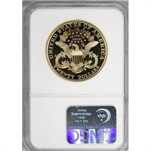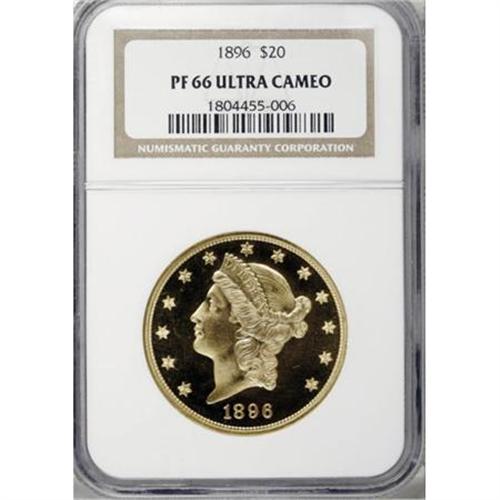 <B>1896 $20 PR66 Deep Cameo NGC.</B></I> Every nuance of the design motifs is boldly brought up on this exquisite Premium Gem proof. Both sides are pristine with magnificent and deeply mirrored fields, exhibiting the watery appearance of true proof coins from the period. The obverse has two or three tiny contact marks on the cheek, a minute flaw on the rim right of star 9, a short diagonal mark in the lower right field, and a nearly invisible copper spot just right of the 9. The reverse has minuscule contact marks directly above the wing and below the outermost stars on the bottom row. Aside from these tiny imperfections, there are no pedigree markers on either side. Normally, small toning spots and other blemishes appear somewhere on the outer obverse or reverse rims, but that is not the case here. A complete lack of such toning spots will make pedigree tracking nearly impossible.<BR><BR><B>Rarity and Population Data</B></I><BR>In 1896, 128 proof double eagles were coined at the Philadelphia Mint, and possibly 40 pieces survive today. The combined total population of NGC and PCGS currently sits at 77 grading events. PCGS has certified 31 proofs, and NGC has certified 46 proofs in all grades and states. The ratio of submissions to survivors is about 2.5 to 1.<BR><BR><B>Grade PCGS NGC Grade PCGS NGC</B></I><BR>PR55 1 0 PR62 Cameo 0 1<BR>PR58 1 4 PR63 Cameo 0 3<BR>PR60 1 0 PR64 Cameo 0 9<BR>PR61 1 0 PR65 Cameo 0 8<BR>PR62 1 0 PR66 Cameo 1 3<BR>PR63 3 0 PR63 Deep Cameo 0 1<BR>PR64 5 1 PR64 Deep Cameo 3 3<BR>PR65 5 1 PR65 Deep Cameo 2 7<BR>PR66 2 0 PR66 Deep Cameo 4 4<BR>PR67 1 0 PR67 Deep Cameo 0 1<BR><BR><B>Die Details</B></I><BR>In his <I>Proof Encyclopedia</B></I>, Breen describes the dies: "In date 1 minutely below center of space between bust and border; left base of 1 well to right of center." We can add to his description that J in J.B.L. is over the inner left curve of the 8. Lapping of the reverse die has created incomplete feathers in the right facing wing below the scroll, and also at the right side of the tail.<BR><BR><B>Existing Proof 1896 Double Eagles</B></I><BR>Although a complete roster of these coins is unavailable, and may be nearly impossible to compile, we present past auction appearance of pieces graded PR64 or finer.<BR><BR>1. PR67. Philadelphia Mint (11/1896); Clapp Collection (1942); Louis E. Eliasberg, Sr.; Eliasberg Estate (Bowers and Ruddy, 10/1982), lot 995.<BR>2. PR66 NGC. Superior (5/1999), lot 3805.<BR>3. PR66. Paramount (1973); Harry Lamborn (Bowers and Ruddy, 10/1977); Paramount; New York Collector; Paramount (8/1979); Martin Haber; Auction ‘88 (David Akers, 7/1988), lot 851.<BR>4. PR65 Ultra Cameo NGC. Hostetler Collection (1/17/1960); Norweb Collection (Bowers and Merena, 11/1988), lot 4056; American Numismatic Rarities (6/2004), lot 1544.<BR>5. PR65 PCGS. Garrett Collection (Stack's, 3/1976), lot 524; later, Harry W. Bass, Jr. (Bowers and Merena, 10/1999), lot 1918.<BR>6. PR65 PCGS. Heritage Bullet (4/1992), lot 5606. <BR>7. PR65. Stack's (10/1990), lot 1696.<BR>8. PR65. Bowers and Merena (8/1987), lot 676. <BR>9. PR65. Superior (6/1987), lot 2907.<BR>10. Gem Proof. Abner Kreisberg (2/1961), lot 1400; John Jay Pittman (David Akers, 10/1997), lot 1169.<BR>1. PR64 Deep Cameo. Smithsonian Institution.<BR>12. PR64 Cameo NGC. Bowers and Merena (8/1991), lot 581; Bowers and Merena (3/1994), lot 1372. <BR>13. PR64 Cameo NGC. Superior (2/1991), lot 2920. <BR>14. PR64 PCGS. Heritage (1/2001), lot 8418.<BR>15. PR64. Stack's (10/1995), lot 1733.<BR>16. PR64. Stack's (10/1995), lot 1734.<BR>17. PR64 PCGS. Bowers and Merena (3/1995), lot 2474. <BR>18. PR64. Stack's (10/1994), lot 1396.<BR>19. PR64 NGC. Ed Trompeter Collection. <BR>20. PR64 PCGS. Superior (8/1991), lot 826.<BR>21. PR64 NGC. Superior (5/1990), lot 5765.<BR><BR><b>Shipping:</b> Coins & Currency (<a target="_blank" href="http://www.heritageauctions.com/common/shipping.php">view shipping information</a>)