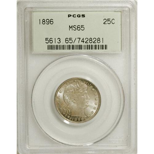 <B>1896 25C MS65 PCGS.</B></I> One of the more available Barber quarters in lower grades, though the population thins out considerably at the Gem level. Swirling blue-green and dusty rose patina graces the shimmering surfaces of this well-defined Gem. Population: 23 in 65, 9 finer (4/07).<BR><BR><b>Shipping:</b> Coins & Currency (<a target="_blank" href="http://www.heritageauctions.com/common/shipping.php">view shipping information</a>)
