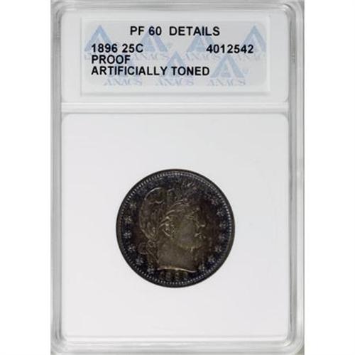<B>1896 25C --Artificially Toned--ANACS. PR60 Details.</B></I> NGC Census: (2/127). PCGS Population (5/137). Mintage: 3,874,762. Numismedia Wsl. Price for NGC/PCGS coin in MS60: $204. (#5613)<BR><BR><B>Coin Engraver:</B> Charles E. Barber<BR><BR><b>Shipping:</b> Coins & Currency (<a target="_blank" href="http://www.heritageauctions.com/common/shipping.php">view shipping information</a>)