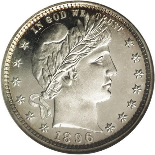 <B>1896<25C> PR65 Cameo NGC.</B></I> Sharp design details and exquisite Cameo contrast are the parameters that sets this example apart from most others. Both sides are fully brilliant with the exception of iridescent peripheral toning. The devices on both sides are fully lustrous with a satiny texture, and it just misses qualifying as an Ultra Cameo example.