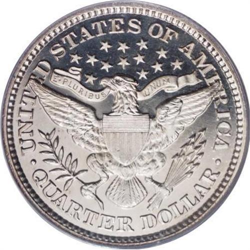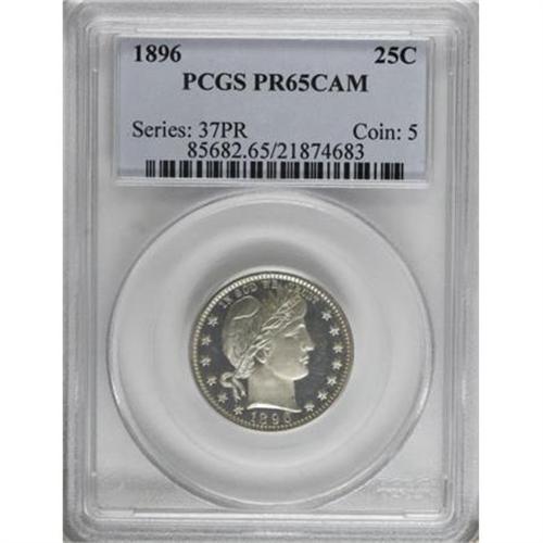 <B>1896 25C PR65 Cameo PCGS.</B></I> Brilliant save for a hint of tan patina on Liberty's neck and three or four tiny obverse toning flecks. Obvious icy frost on the devices and deep mirror fields approach a Deep Cameo designation, and the pinpoint-sharp strike is also worthy of mention. Only a few wispy slide marks on the cheek deny assessment at a higher grade. A scant 762 proofs were issued. Population: 6 in 65 Cameo, 13 finer (8/07).<BR><BR><b>Shipping:</b> Coins & Currency (<a target="_blank" href="http://www.heritageauctions.com/common/shipping.php">view shipping information</a>)