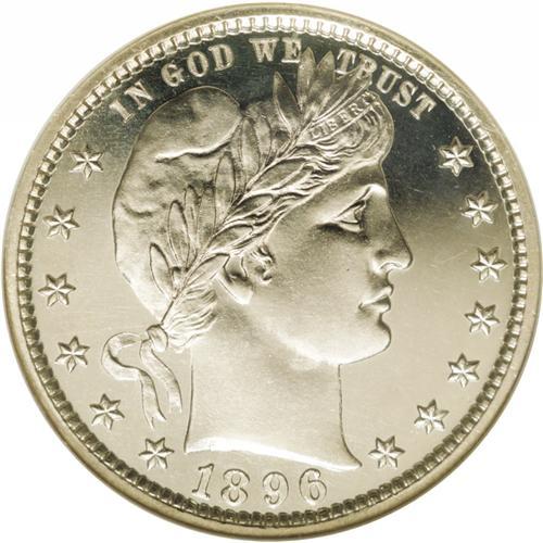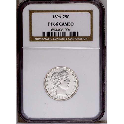 <B>1896<25C> PR66 Cameo NGC.</B></I> Fully brilliant with chalky-white features that seem afloat in deep pools of watery reflectivity. Both the quality of production and the level of preservation are near their peak on this high quality specimen. Census: 20 in 66 Cameo, 20 finer (3/06).