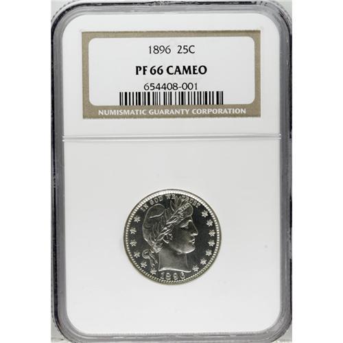 <B>1896 25C PR66 Cameo NGC.</B></I> Fully brilliant with chalky-white crisply struck design features that seem afloat in deep pools of watery reflectivity. Both the quality of production and the level of preservation are near their peak on this high quality specimen. Census: 17 in 66 Cameo, 25 finer (12/06).<BR><BR><b>Shipping:</b> Coins & Currency (<a target="_blank" href="http://www.heritageauctions.com/common/shipping.php">view shipping information</a>)