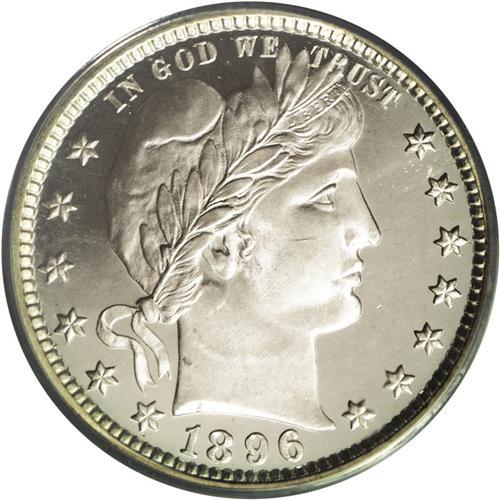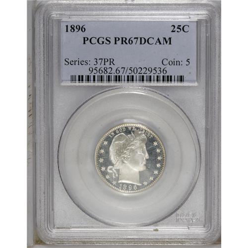 <B>1896<25C> PR67 Deep Cameo PCGS.</B></I> As much as the Barber coinage design has been maligned, since its outset in 1892, as unimaginative and aesthetically unappealing, it would be difficult for anyone to argue successfully that Barber proof coinage does not exhibit more than its fair share of beauty compared to other U.S. series, from either earlier or later eras. This stunning Superb Gem quarter is an excellent example. The stark white-on-black contrast seen on both sides is comparable to that boasted of by modern proofs from post-1950. The striking details are impeccable and the surfaces are most impressively preserved. For the sake of accuracy, we note a small contact mark on Liberty's cheekbone, and another on the reverse shield, but these minor imperfections are easy to forgive when admiring this lovely specimen. Population: 8 in 67 Deep Cameo, 2 finer (8/06).