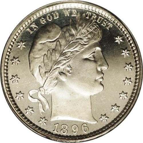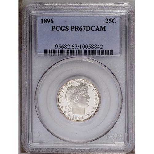 <B>1896<25C> PR67 Deep Cameo PCGS.</B></I> Both sides of this needle-sharp, Superb Gem example present as fully brilliant. Not only the portrait and eagle display prominent white-on-black contrast, but the stars, legends, and date are also frosty. A few small marks and luster grazes on the principal obverse device are noted merely for pedigree purposes. Only 762 proofs were struck in 1896. Population: 7 in 67 Deep Cameo, 2 finer (4/06).