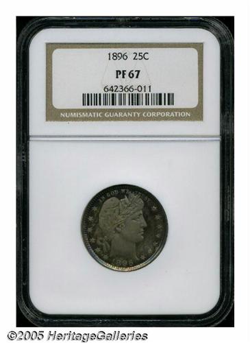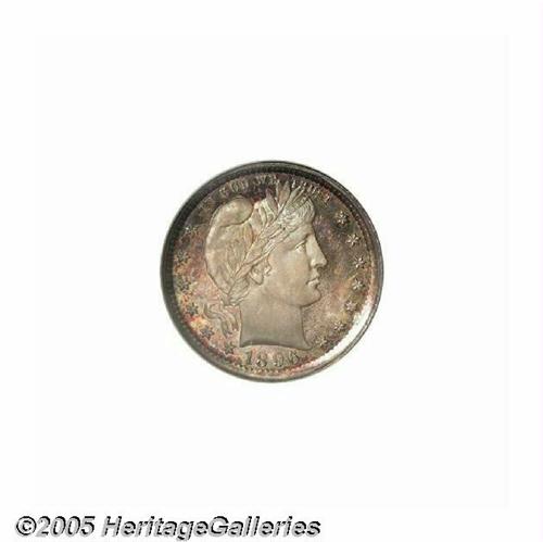 <B>1896<25C> PR67 NGC.</B></I> A highly attractive Superb Gem Proof example with considerable cameo contrast beneath the delicate rainbow toning splashed across both surfaces. The Proof mintage of this issue was limited to just 762 pieces, a dramatic decrease from the mintage of the first Barber Quarter issue in 1892. Mintages of Proof coins increased or decreased from year to year, providing a window to the popularity of coin collecting at any given time. Both the obverse and reverse are sharp at the centers, while portions of the dentils are weakly struck, unusual for Proof. Population: 19 in 67, 21 finer (6/05).