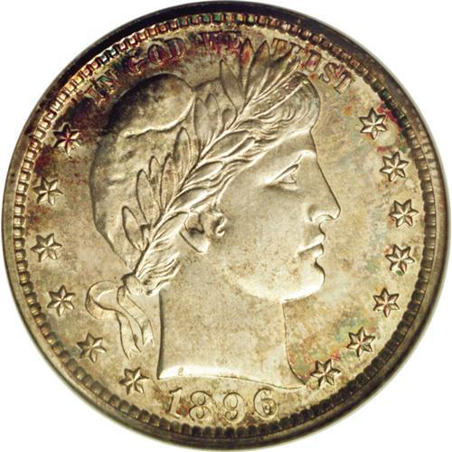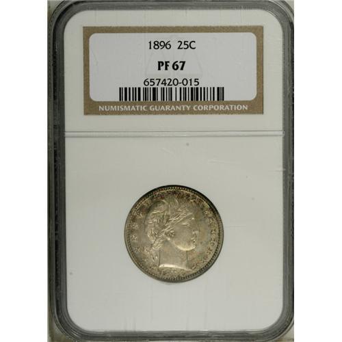 <B>1896 25C PR67 NGC.</B></I> Dashes of lovely gold, rose, ocean-blue, and ruby-red color adorn the fields and borders of this needle-sharp Superb Gem. The lightly frosted devices are lightly toned golden-brown. An elegant high-grade representative of this elusive issue, one of only 762 proofs struck. Census: 19 in 67, 21 finer (12/06).<BR><BR><b>Shipping:</b> Coin/Currency (<a target="_blank" href="http://www.heritageauctions.com/common/shipping.php">view shipping information</a>)