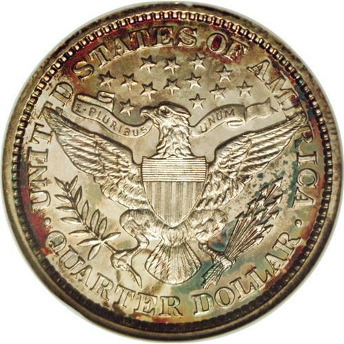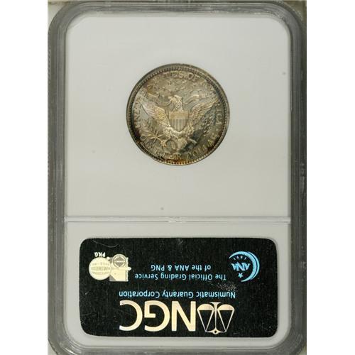 1896 25C PR67 NGC. Dashes of lovely gold, rose, ocean-