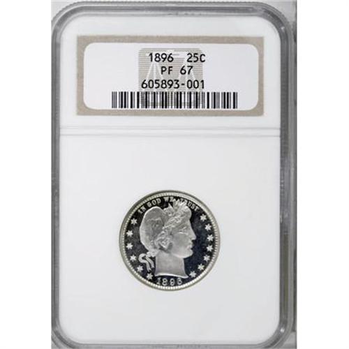 <B>1896 25C PR67 NGC.</B></I> A gleaming representative with delightfully frosted, sharply struck devices and gleaming fields that show slight haze over parts of the reverse. Both sides show obvious contrast, though this did not translate into a Cameo designation on the holder. Beautifully preserved and delightful for this earlier Barber proof issue. Census: 19 in 67, 21 finer (12/07).<BR><BR><B>Coin Engraver:</B> Charles E. Barber<BR><BR><b>Shipping:</b> Coins & Currency (<a target="_blank" href="http://www.heritageauctions.com/common/shipping.php">view shipping information</a>)