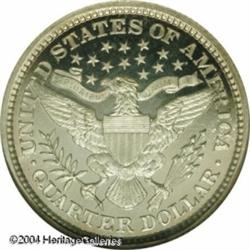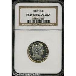 1896 25C PR67 Ultra Cameo NGC. The upper obverse p <B>1896 25C PR67 Ultra Cameo NGC.</B></I> The upper obverse periphery offers a glimpse of iridescent peach color, although the remainder of this needle-sharp Superb Gem is brilliant. Not only the portrait and eagle display prominent white on black contrast, but the stars, legends, and date are also frosty. A short mint-made lintmark near the center of the obverse is noted merely for pedigree purposes. Only 762 proofs were struck. <BR><BR><B>Important notice:</B> Heritage usually auctions material at the rate of 200-250 lots per hour. On some occasions eBay Live bid software or the Internet may not be able to keep up with the pace of the auction. We recommend placing a realistic absentee bid now as insurance to avoid disappointment. Occasionally the auctioneer may eliminate or reject an eBay Live bid, and the auctioneer may also reopen a lot after the close of the eBay live bidding (usually because we missed an audience bid), and may reject your bid even if it shows you as the winning bidder. By bidding via eBay Live, you agree that Heritage may award the lot to another bidder at its sole discretion under the circumstances described above or any other reasonable circumstances. Since eBay bids are not shown to us until we open the lot on the floor, we treat those bids just like floor bids. In most cases the floor responds before the eBay bid is presented to us, due to Internet lag time, so for consistency we have made it a policy that floor bids are always considered first over tie eBay live bids. Also please note that all Heritage lots purchased through eBay Live carry a 20% Buyer's Premium. Please make sure you read the Terms and Conditions before you bid. This lot is being auctioned in conjunction with a live floor auction by Heritage Galleries & Auctioneers. All final auction and invoice information will be supplied by Heritage Galleries & Auctioneers, and all other information should be considered preliminary. Lot:5922
