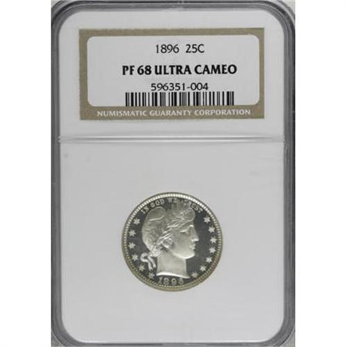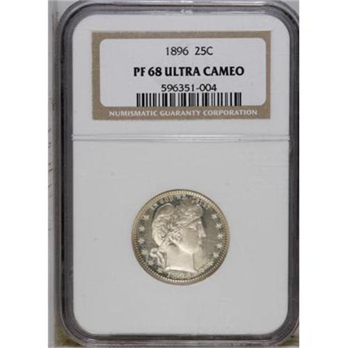 <B>1896 25C PR68 Ultra Cameo NGC.</B></I> The silver proofs of the 1890s are famous for the powerful contrast found on many examples, and the quarter offered here strongly reinforces that reputation. The subtly gold-toned mirrors display immense reflectivity, and the devices are crisply defined, even on features that appear weak even on most proofs, such as the fletchings and claws on the reverse, as well as the eagle's shoulders. As one might infer from the grade, the piece seems practically perfect to the unaided eye, and even under magnification, only the most trivial flaws appear. A specimen with finer eye appeal is difficult to imagine. Of the 26 Ultra Cameo examples certified by NGC, just three grade finer, one in 68 <img border='0' src='http://www.heritagecoins.com/images/star.gif' width=10 height=10> and two in 69.<BR><BR><b>Shipping:</b> Coins & Currency (<a target="_blank" href="http://www.heritageauctions.com/common/shipping.php">view shipping information</a>\)