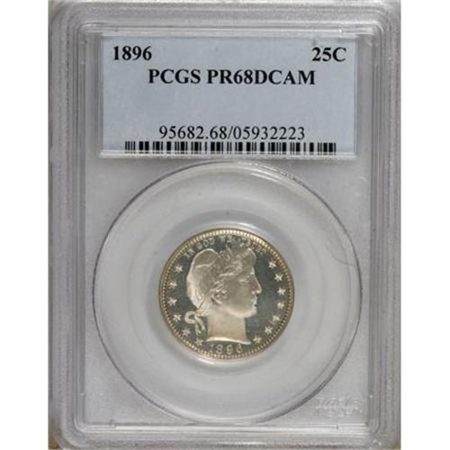 <B>1896 25C PR68 Deep Cameo PCGS.</B></I> Various styles of proofs have come and gone throughout American numismatic history, and the frosted proof is no exception. Prior to the contemporary era of frosted proofs, the technique reached its zenith in the mid-1890s, a fact acknowledged by many who write about the most famous proof issue of the time, the 1895 Morgan dollar. The finest examples of other issues confirm that opinion, specimens such as the piece offered here.<BR> The mirrors have seemingly limitless reflectivity, and the surfaces remain essentially untoned. The decisively struck devices exhibit rich frost with only a few minuscule breaks at the lower neck. As carefully preserved as one could expect for a century-old coin, this example has remarkable and enduring visual appeal. A wonderful choice for the discerning collector. Population: 2 in 68 Deep Cameo, 0 finer (4/07).<BR><BR><b>Shipping:</b> Coins & Currency (<a target="_blank" href="http://www.heritageauctions.com/common/shipping.php">view shipping information</a>)