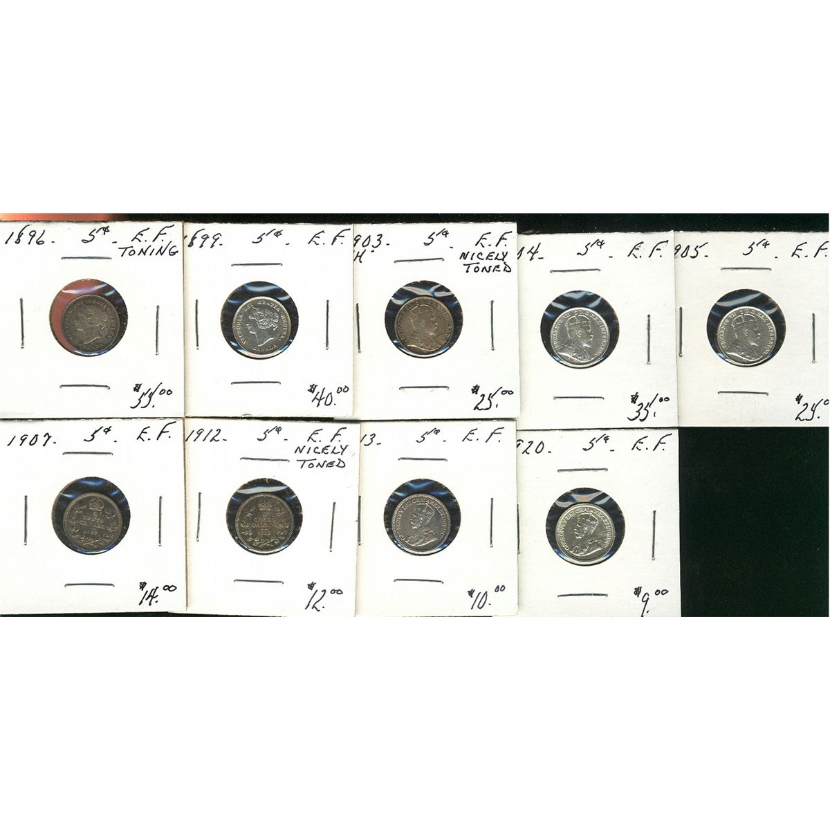 1896 5¢, 1899, 1903H, 1904, 1905, 1907, 1912, 1913 & 1920. Lot of 9 coins all EF. (PBA).