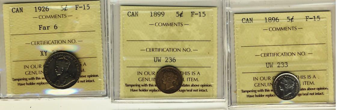 1896 5¢, 1899 & 1926 Far ICCS F15. Lot of 3 coins.