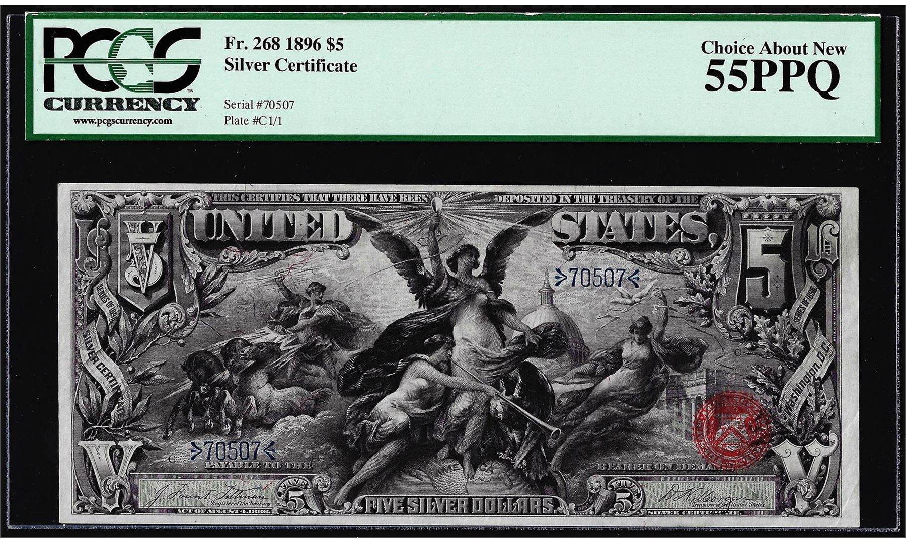One 1896 $5 Educational Silver Certificate Note Fr.268 PCGS Choice About New 55PPQ. PCGS Graded.