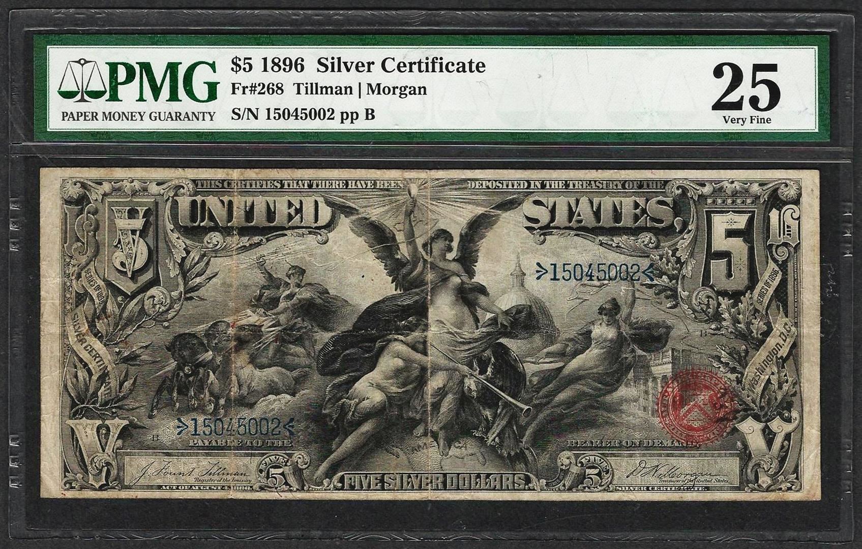 One 1896 $5 Educational Silver Certificate Note Fr.268 PMG Very Fine 25. PMG Certified.