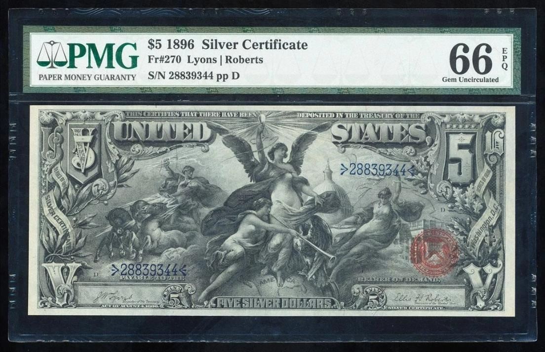 One 1896 $5 Educational Silver Certificate PMG 66EPQ.