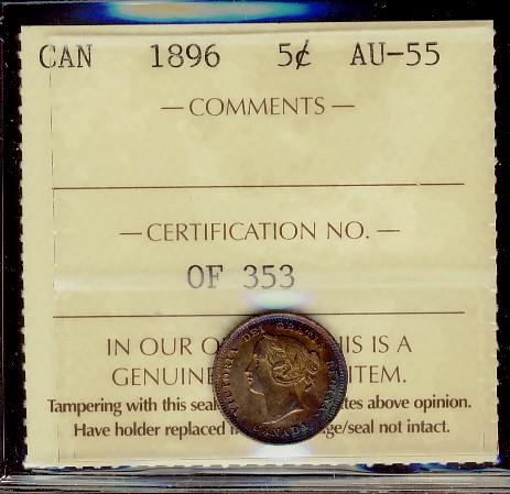 1896 5¢ ICCS AU55, nice with attractive toning.
