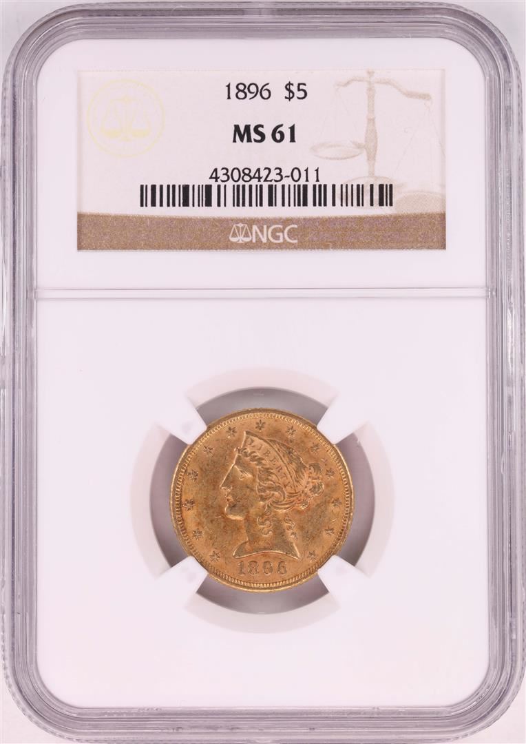 One 1896 $5 Liberty Head Half Eagle Coin NGC MS61. NGC Certified.