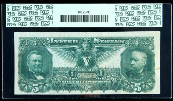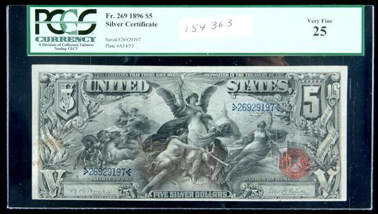 1896, $5 Silver Certificate. PCGS Very Fine 25. . Fr-269. . KL-239. This is a lovely, fully original example of a beautiful type that is often considered the most elegant example of engraving art on U.S. Currency. Bold embossing is still visible throughout, and a "PPQ" designation from PCGS Currency was likely withheld only because of some light soiling on either side. A beautiful circulated Educational Five that should see spirited bidding.