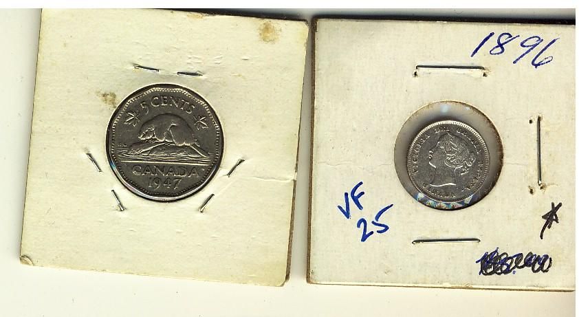 1896 5¢ VF-20, 1947 Dot 5¢ F-12, lot of 2 coins.