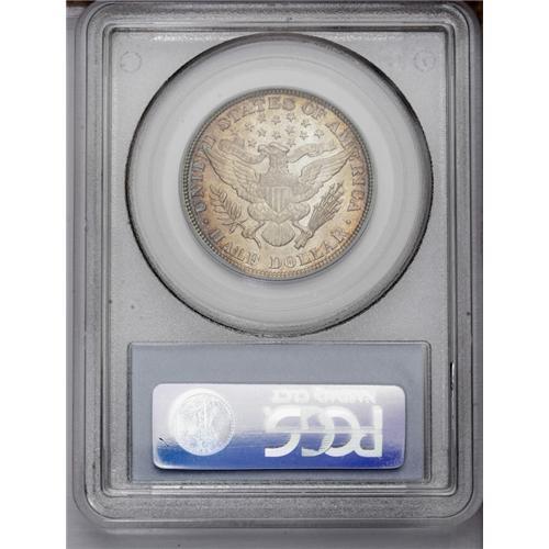 <B>1896 50C MS62 PCGS.</B></I> Semi-bright silvery surfaces display traces of cobalt-blue, lavender, and golden-brown patination around some of the borders. The design features are well impressed, except for minor softness in the upper right (facing) corner of the shield. Minute handling marks are visible on Liberty's cheek and neck. Population: 15 in 62, 65 finer (12/05).