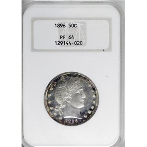 <B>1896 50C PR64 NGC.</B></I> Splashes of cherry-red, ocean-blue, and apricot adorn the borders of this beautiful and razor-sharp near-Gem. Only 762 proofs were struck. Certified in an early pre-hologram NGC holder.<BR><BR><b>Shipping:</b> Coins & Currency (<a target="_blank" href="http://www.heritageauctions.com/common/shipping.php">view shipping information</a>)