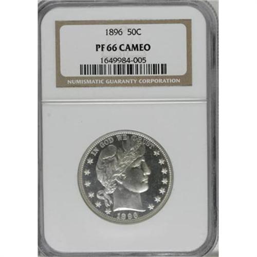 <B>1896 50C PR66 Cameo NGC.</B></I> This sharply struck Premium Gem is close to brilliant, although the portrait edges show hints of tan patina. Both major devices are suitably frosted, and, as expected for the PR66 grade level, the highly reflective fields are smooth and essentially void of hairlines. Census: 11 in 66 Cameo, 12 finer (12/07). <BR><BR><b>Shipping:</b> Coins & Currency (<a target="_blank" href="http://www.heritageauctions.com/common/shipping.php">view shipping information</a>)