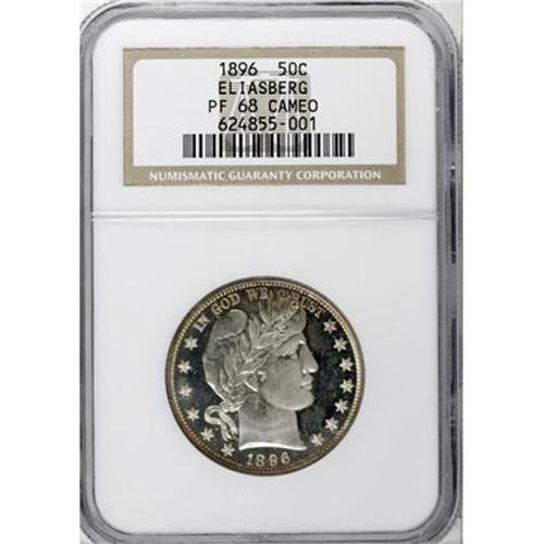 <B>1896 50C PR68 Cameo NGC.</B></I> Ex: Eliasberg. The extraordinary quality of this piece makes one think, even before the pedigree is known, that some special set of circumstances conspired account for the appearance of this coin. Then when one reads the pedigree in the Eliasberg catalog it becomes obvious that this coin has hardly ever been touched since it was minted in 1896 as John Clapp purchased this piece directly from the mint in that year. <BR> The majority of each side is still brilliant, but there is a significant presence of light golden patina that surrounds the peripheries on each side. Intricately detailed, as one would expect from a proof. The surfaces are essentially perfect throughout.<BR><I>Purchased by John Clapp directly from the Philadelphia Mint in June 1896; Clapp estate, 1942, to Louis Eliasberg, Sr.; Eliasberg II (Bowers and Merena, 4/1997), lot 2076.</B></I><BR><BR><b>Shipping:</b> Coins & Currency (<a target="_blank" href="http://www.heritageauctions.com/common/shipping.php">view shipping information</a>)