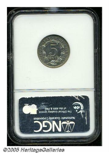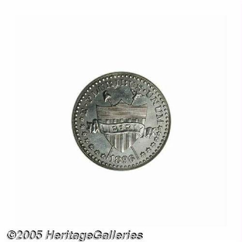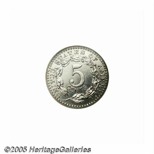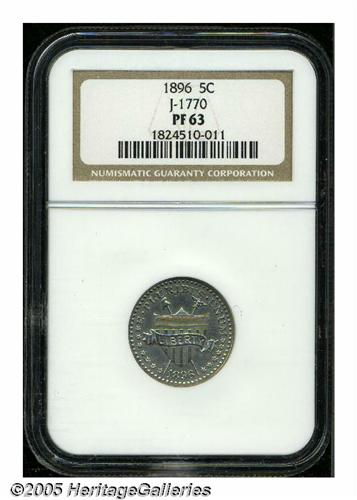 <B>1896<5C> Five Cents, Judd-1770, Pollock-1987, Low R.6, PR63 NGC.</B></I> Charles Barber design shows a shield with 13 stripes on the obverse. E PLURIBUS UNUM is above and the date below. Behind the shield are two crossed poles bearing a liberty cap and eagle. A scroll passing in front of the shield is inscribed LIBERTY. There are 13 stars at the border, arranged 7 left and 6 right. The border is beaded on both sides. The denomination 5 CENTS is centered within a curved olive sprig on the reverse. Struck in some combination of standard coin nickel and perhaps with a smidgen of zinc or some form of German silver (metallurgical studies have not been conducted on this design type), with a plain edge. Lightly mirrored with pale nickel-gray surfaces, minor abrasions, and faint hairlines.