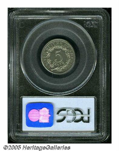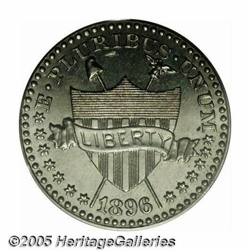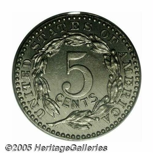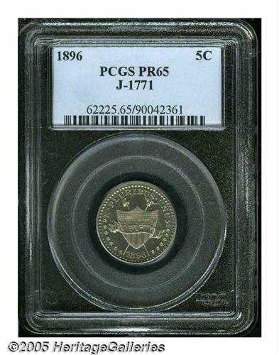 <B>1896<5C> Five Cents, Judd-1771, Pollock-1986, Low R.6, PR65 PCGS.</B></I> The obverse depicts a shield with 13 stripes and a scroll inscribed LIBERTY that passes in front. Behind are two crossed poles, one bearing an eagle, the other a liberty cap. E PLURIBUS UNUM is above, 1896 is below. The reverse shows 5 CENTS within a curved olive sprig with UNITED STATES OF AMERICA around. The border is beaded on both sides. Struck in nickel with a plain edge. The surfaces are untoned and well struck with moderately good reflectivity in the fields. A pleasing Gem example of this late-date pattern that is distinguished by a short grease stain in the upper reverse field to the right of the flag on the 5 and a tiny black spot under the right upright of UNUM.<BR><I>From The Western Hills Collection.</B></I>
