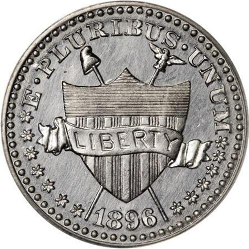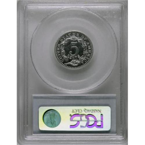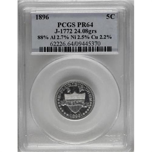 <B>1896 5C Five Cents, Judd-1772, Pollock-1989, High R.6, PR64 PCGS.</B></I> This 1896 pattern design features a large shield in the center of the obverse with crossed poles behind and a large ribbon across the center of the shield. The reverse has a large numeral 5 with CENTS in small letters below, surrounded by a curved olive sprig. Struck in aluminum with a plain edge. Pollock lists four different alloys for this aluminum striking. However, the composition of this piece is unlisted. It has been metallurgically tested by PCGS and the percentage of aluminum is significantly lower than the four compositions listed in Pollock. The insert lists this piece as: 88% aluminum, 2.7% nickel, 2.5% copper, and 2.2% something else (apparently they ran out of room on the insert). The surfaces are bright as would be expected from an aluminum striking with nicely reflective fields and no oxidation. <BR><BR><b>Shipping:</b> Coins & Currency (<a target="_blank" href="http://www.heritageauctions.com/common/shipping.php">view shipping information</a>)