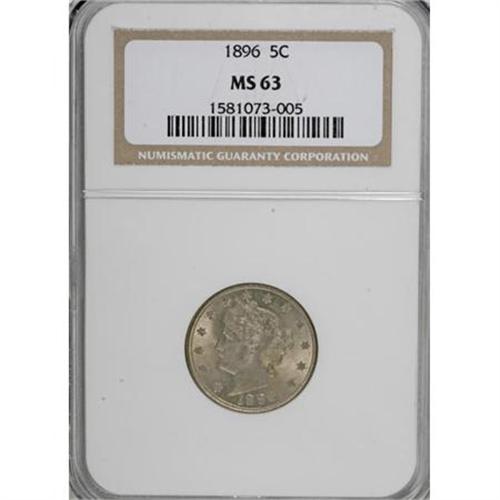 <B>1896 5C MS63 NGC.</B></I> NGC Census: (50/122). PCGS Population (73/147). Mintage: 8,842,920. Numismedia Wsl. Price for NGC/PCGS coin in MS63: $208. (#3857)<BR><BR><B>Coin Engraver:</B> Charles E. Barber<BR><BR><b>Shipping:</b> Coins & Currency (<a target="_blank" href="http://www.heritageauctions.com/common/shipping.php">view shipping information</a>)