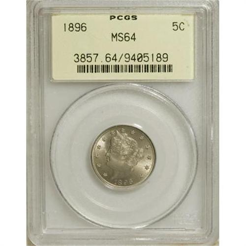 <B>1896 5C MS64 PCGS.</B></I> PCGS Population (105/70). NGC Census: (78/44). Mintage: 8,842,920. Numismedia Wsl. Price for NGC/PCGS coin in MS64: $320. (#3857)<BR><BR><B>Coin Engraver:</B> Charles E. Barber<BR><BR><b>Shipping:</b> Coins & Currency (<a target="_blank" href="http://www.heritageauctions.com/common/shipping.php">view shipping information</a>)