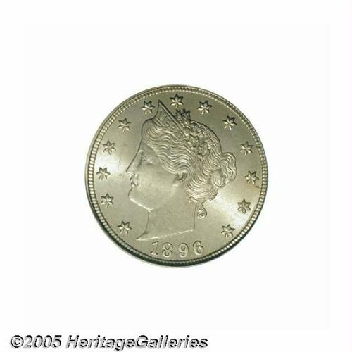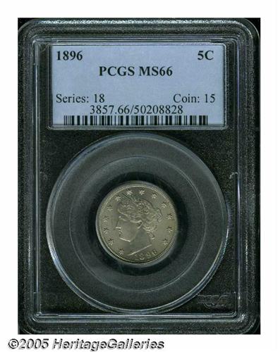 <B>1896<5C> MS66 PCGS.</B></I> A delicately toned Premium Gem with excellent sharpness over the major design elements. The satiny surfaces are especially vibrant and display few appreciable signs of contact. A similarly certified example realized over $19,000 in our 2005 Central States Sale. Population: 4 in 66, 0 finer (6/05).