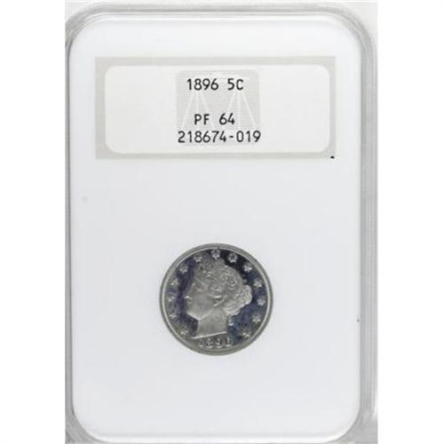 <B>1896 5C PR64 NGC.</B></I> NGC Census: (126/136). PCGS Population (192/89). Mintage: 1,862. Numismedia Wsl. Price for NGC/PCGS coin in PR64: $276. (#3894)<BR><BR><B>Coin Engraver:</B> Charles E. Barber<BR><BR><b>Shipping:</b> Coins & Currency (<a target="_blank" href="http://www.heritageauctions.com/common/shipping.php">view shipping information</a>)