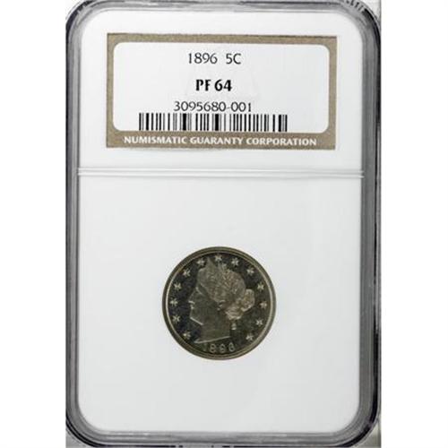 <B>1896 5C PR64 NGC.</B></I> NGC Census: (127/136). PCGS Population (194/89). Mintage: 1,862. Numismedia Wsl. Price for NGC/PCGS coin in PR64: $260. (#3894)<BR><BR><B>Coin Engraver:</B> Charles E. Barber<BR><BR><b>Shipping:</b> Coins & Currency (<a target="_blank" href="http://www.heritageauctions.com/common/shipping.php">view shipping information</a>)