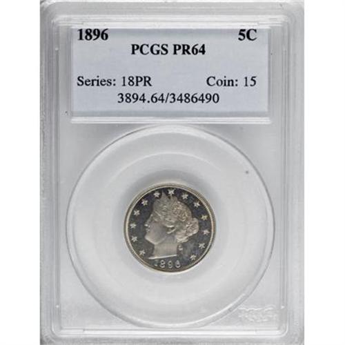<B>1896 5C PR64 PCGS.</B></I> PCGS Population (194/89). NGC Census: (126/136). Mintage: 1,862. Numismedia Wsl. Price for NGC/PCGS coin in PR64: $276. (#3894)<BR><BR><B>Coin Engraver:</B> Charles E. Barber<BR><BR><b>Shipping:</b> Coins & Currency (<a target="_blank" href="http://www.heritageauctions.com/common/shipping.php">view shipping information</a>\)