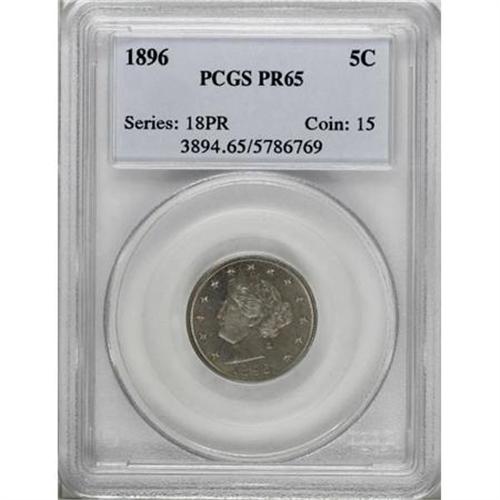 <B>1896 5C PR65 PCGS.</B></I> PCGS Population (68/22). NGC Census: (90/46). Mintage: 1,862. Numismedia Wsl. Price for NGC/PCGS coin in PR65: $510. (#3894)<BR><BR><B>Coin Engraver:</B> Charles E. Barber<BR><BR><b>Shipping:</b> Coins & Currency (<a target="_blank" href="http://www.heritageauctions.com/common/shipping.php">view shipping information</a>)