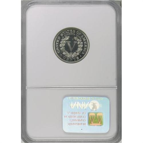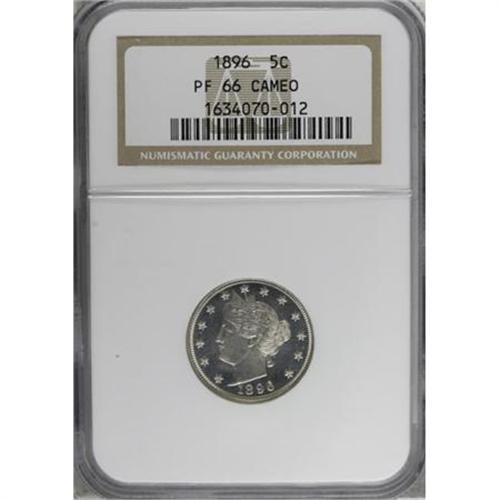 <B>1896 5C PR66 Cameo NGC.</B></I> Crisply struck with gleaming, carefully preserved champagne-tinged surfaces. A touch of cloudy toning is present above the V on the reverse between the ends of the wreath. An attractive late 19th century nickel proof that shows considerable contrast. Census: 8 in 66 Cameo, 3 finer (8/07).<BR><I>From The Mario Eller Collection, Part One.</B></I><BR><BR><b>Shipping:</b> Coins & Currency (<a target="_blank" href="http://www.heritageauctions.com/common/shipping.php">view shipping information</a>)