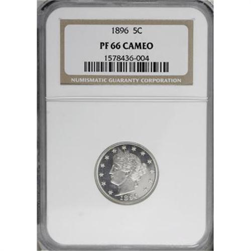 <B>1896 5C PR66 Cameo NGC.</B></I> A bold Cameo proof with thickly frosted devices and black mirrors. A hint of pale lilac tone is noted across otherwise untoned services and the strike is bold. A very attractive late nineteenth century proof.<BR><BR><b>Shipping:</b> Coins & Currency (<a target="_blank" href="http://www.heritageauctions.com/common/shipping.php">view shipping information</a>)