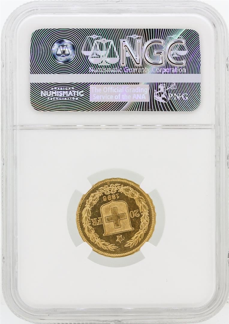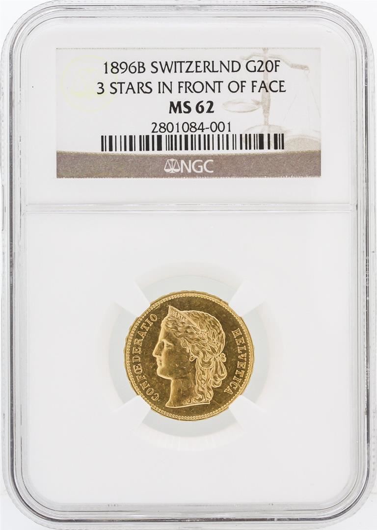 One 1896-B NGC MS62 3 Stars in Front of Face Switzerland G20F Gold Coin. NGC Certified.
