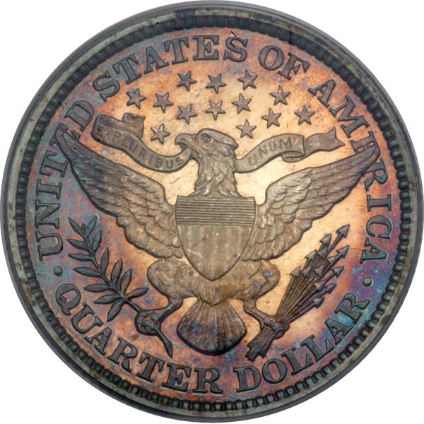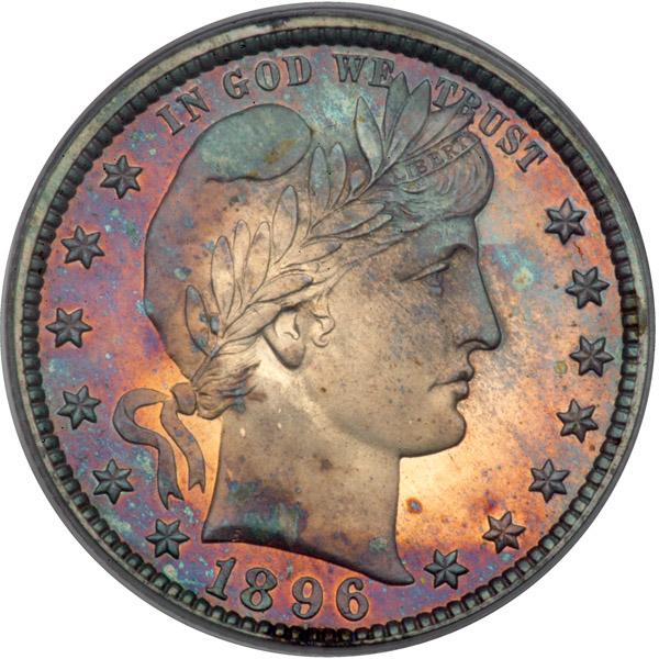 1896. PCGS graded Proof 64 Cameo CAC Approved. Vivid gold, violet and royal blue toning. Only 762 Proofs struck and a virtual gem. Pop 8; 22 finer (PCGS # 85682) .